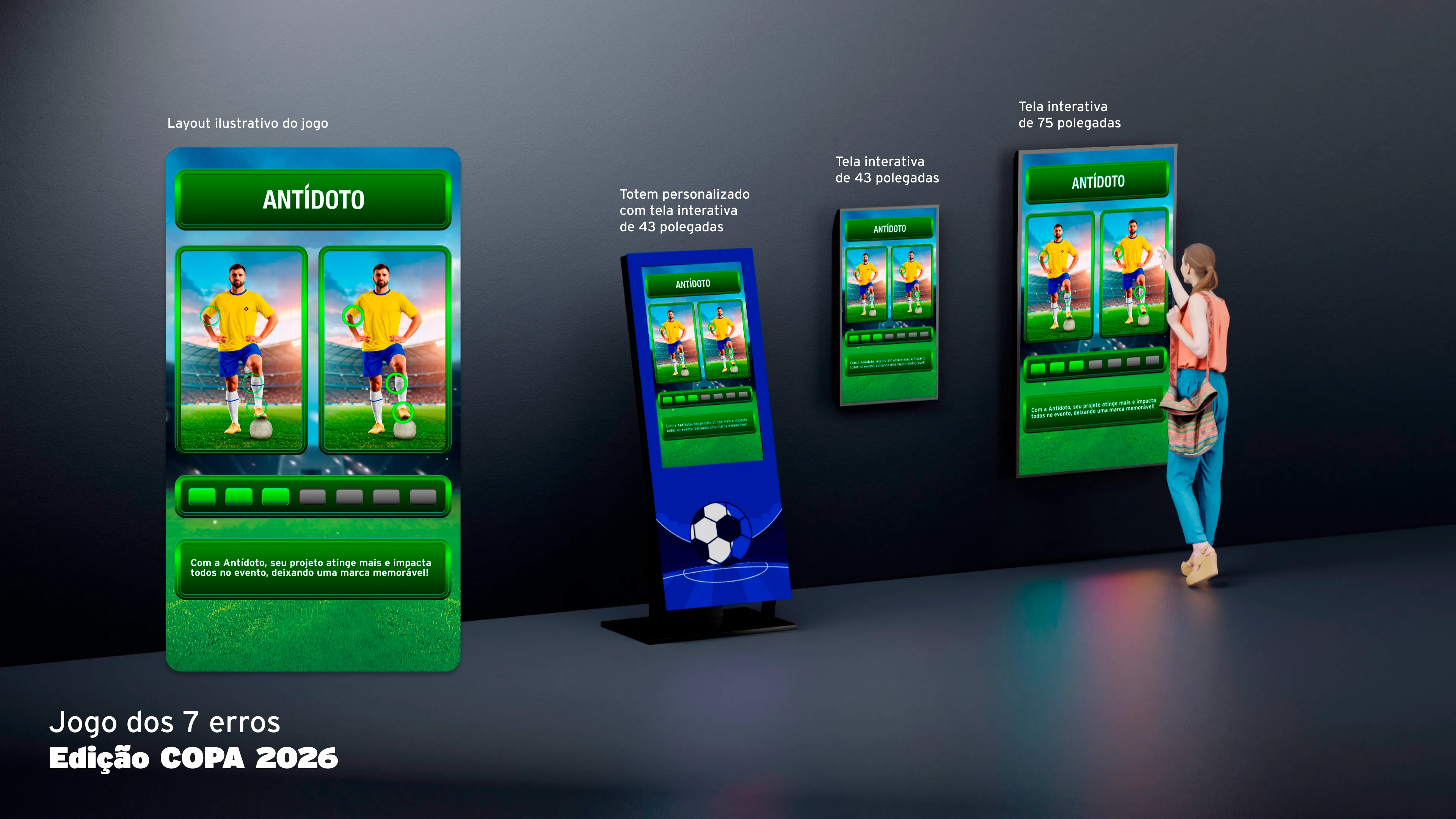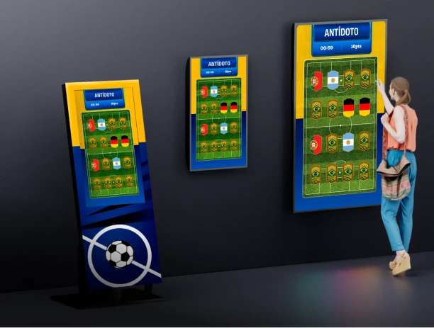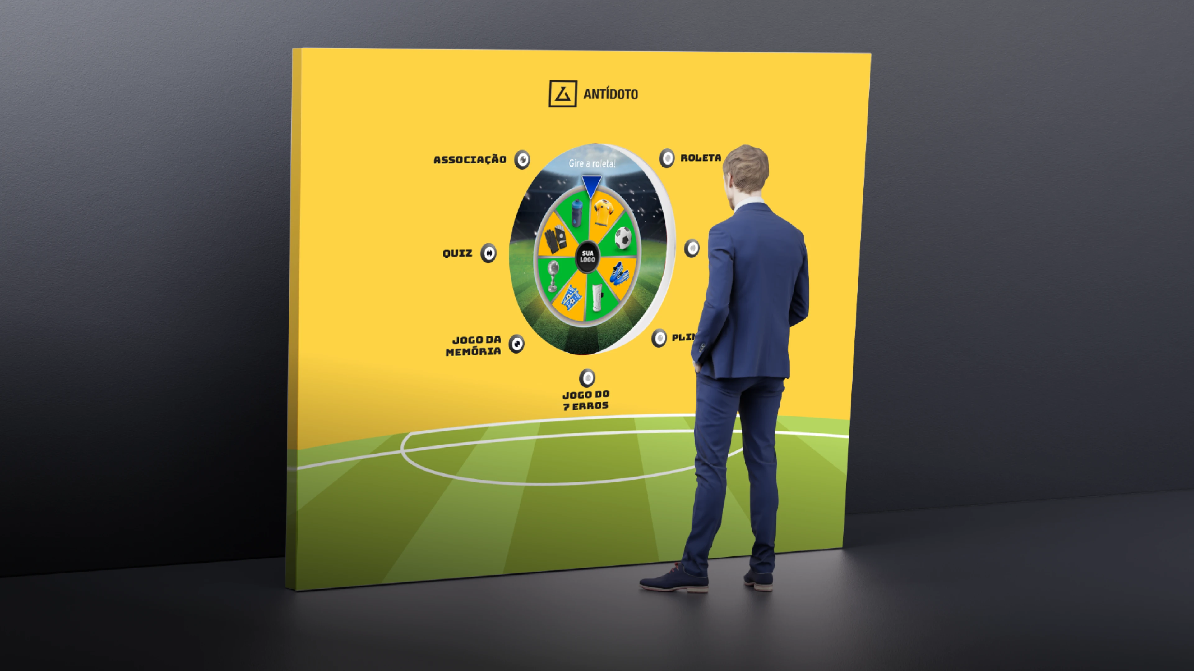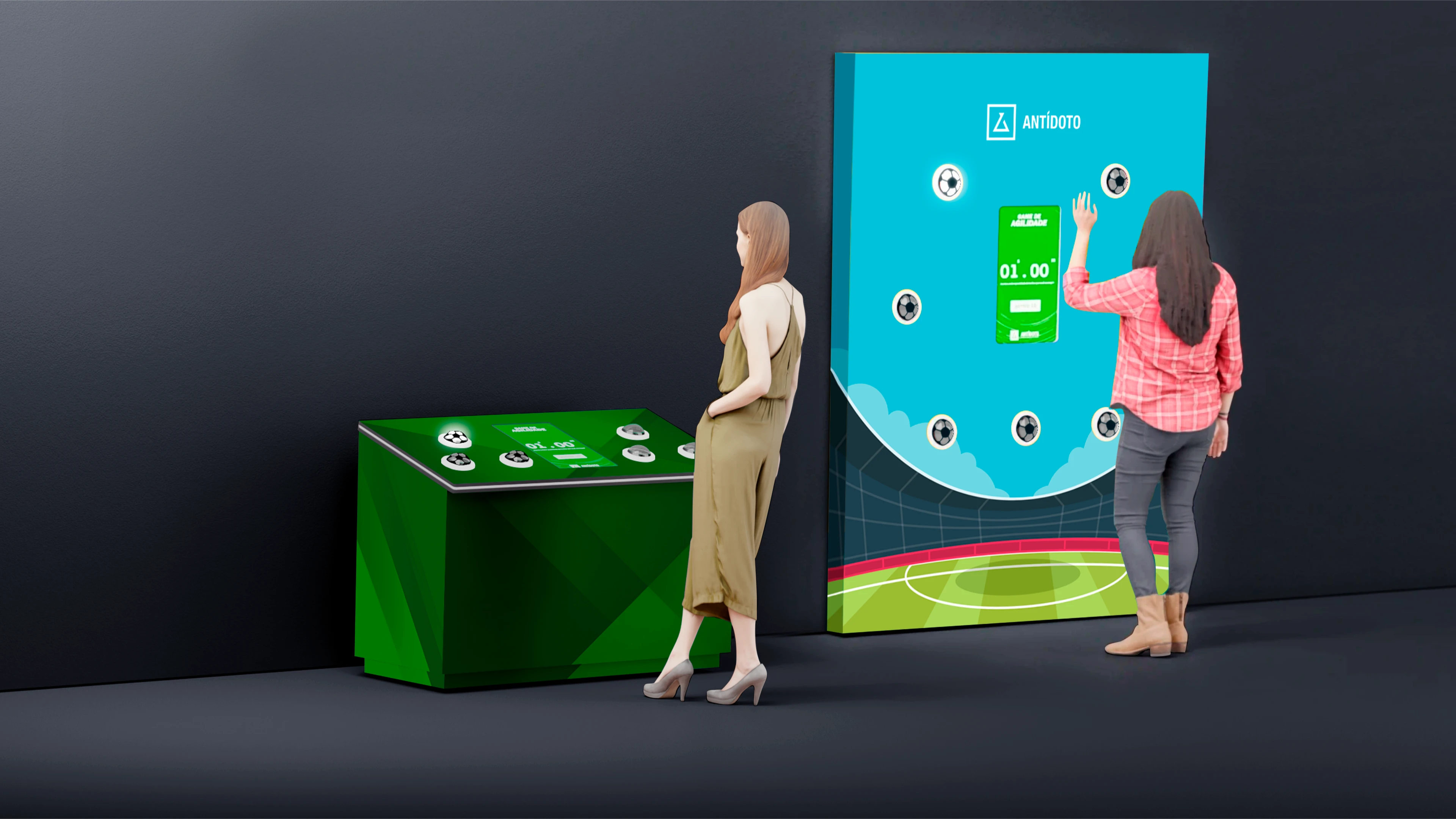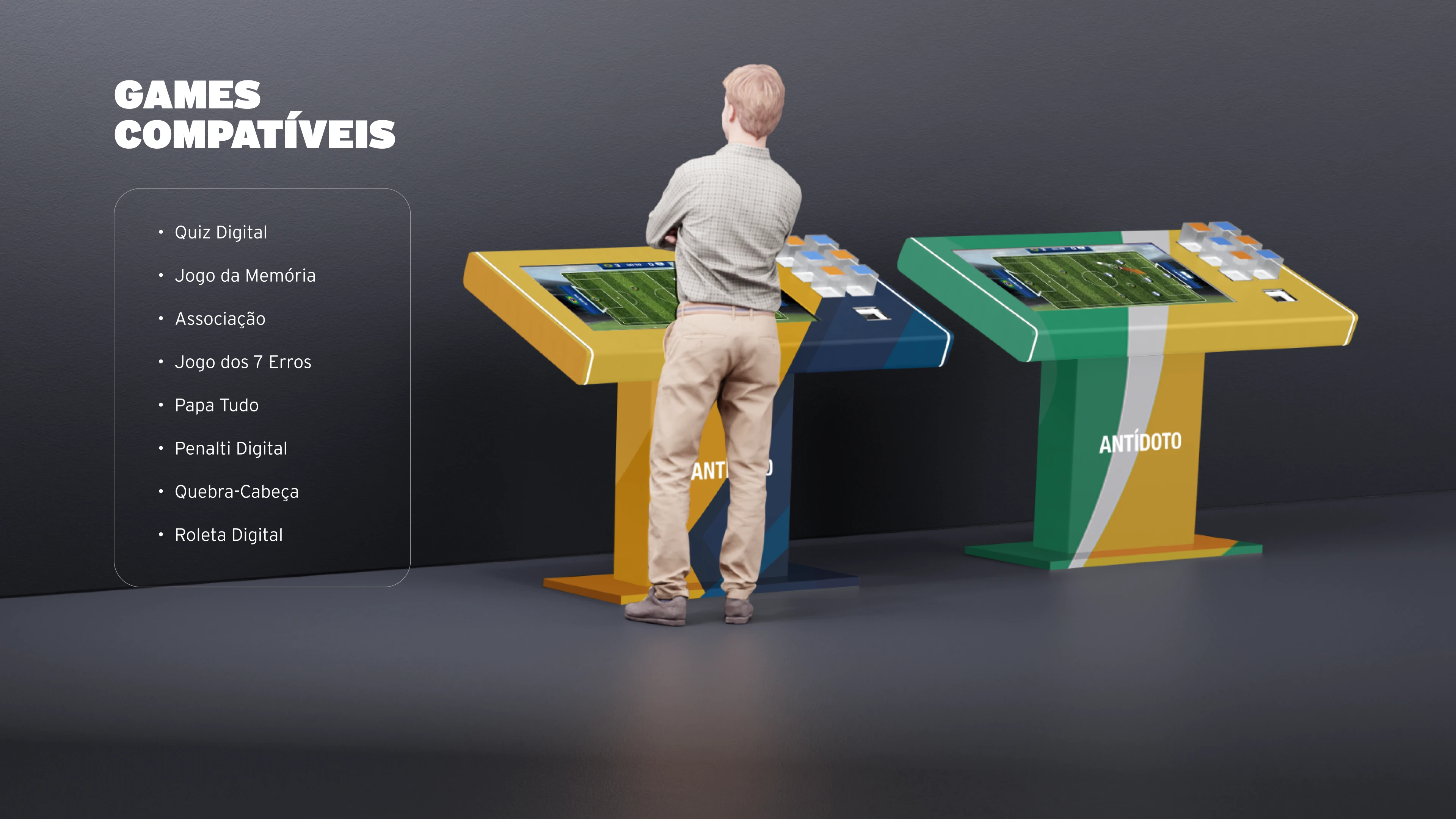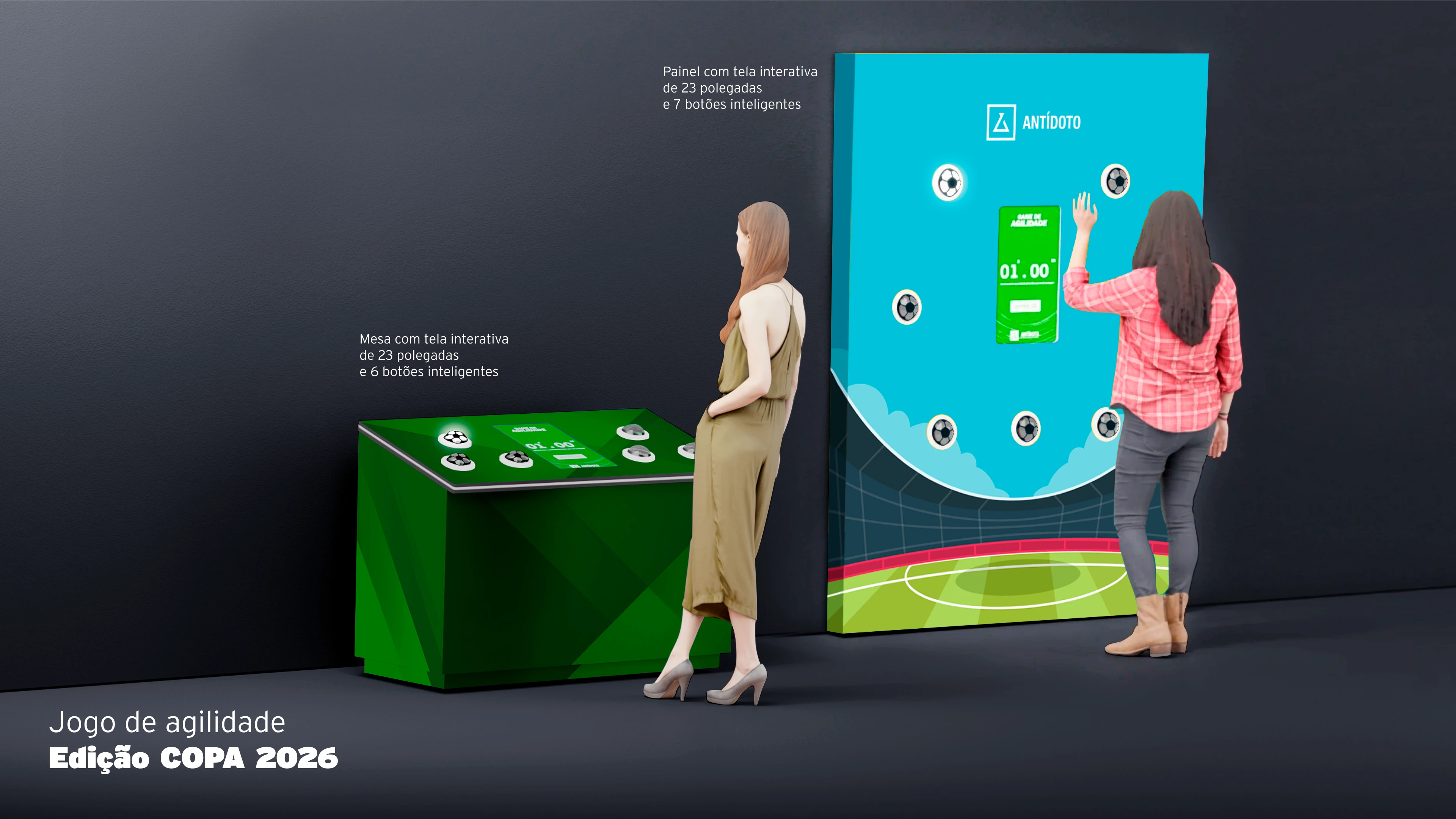 Estações interativas da Antídoto com tema Copa reúnem diversos games simultâneos, todos com temática de futebol.
