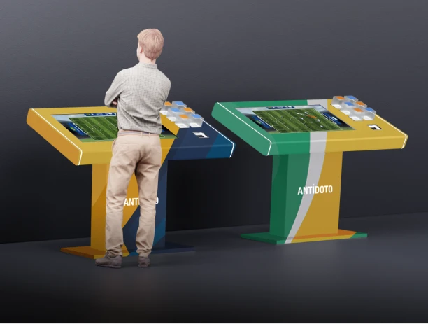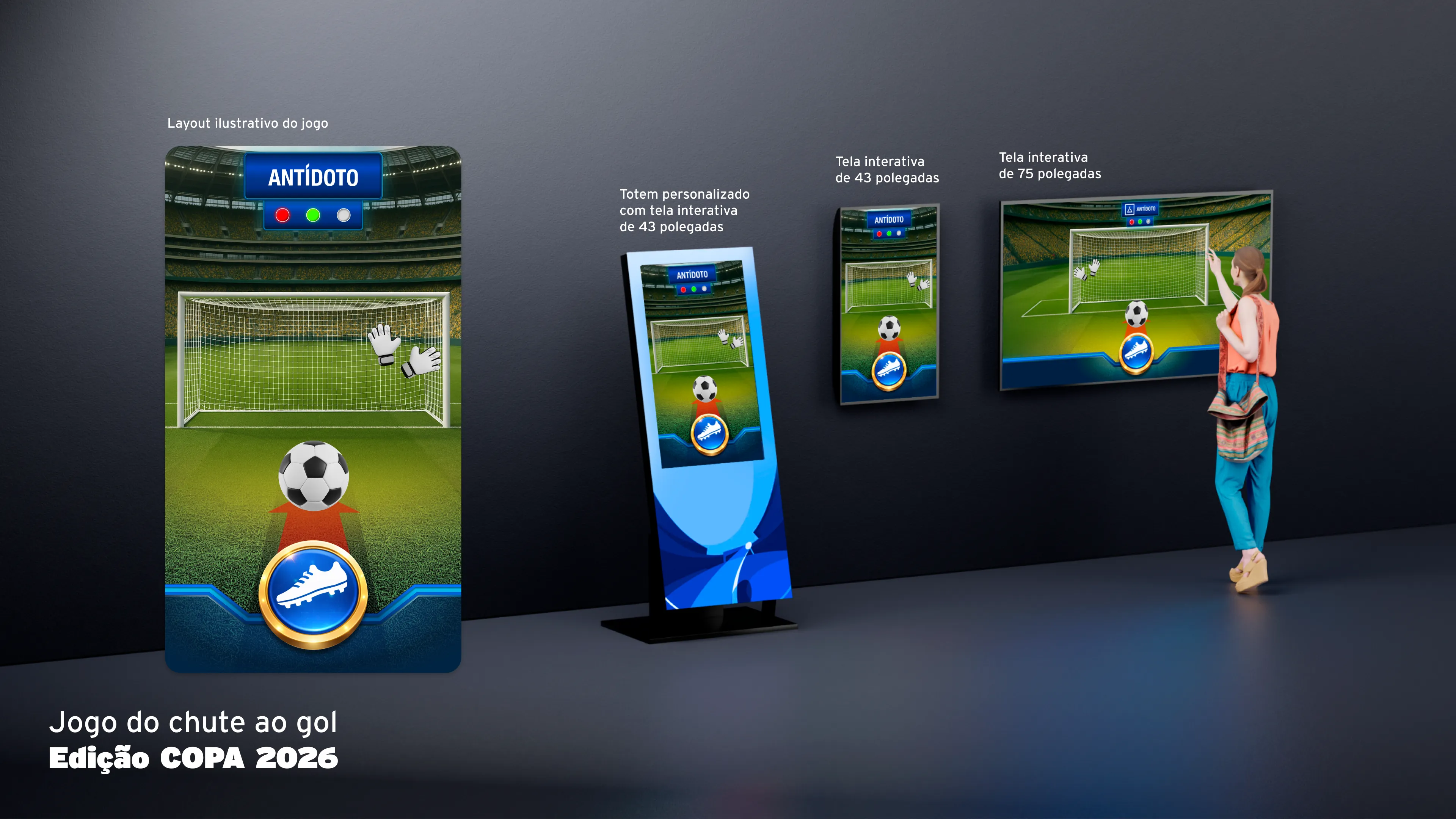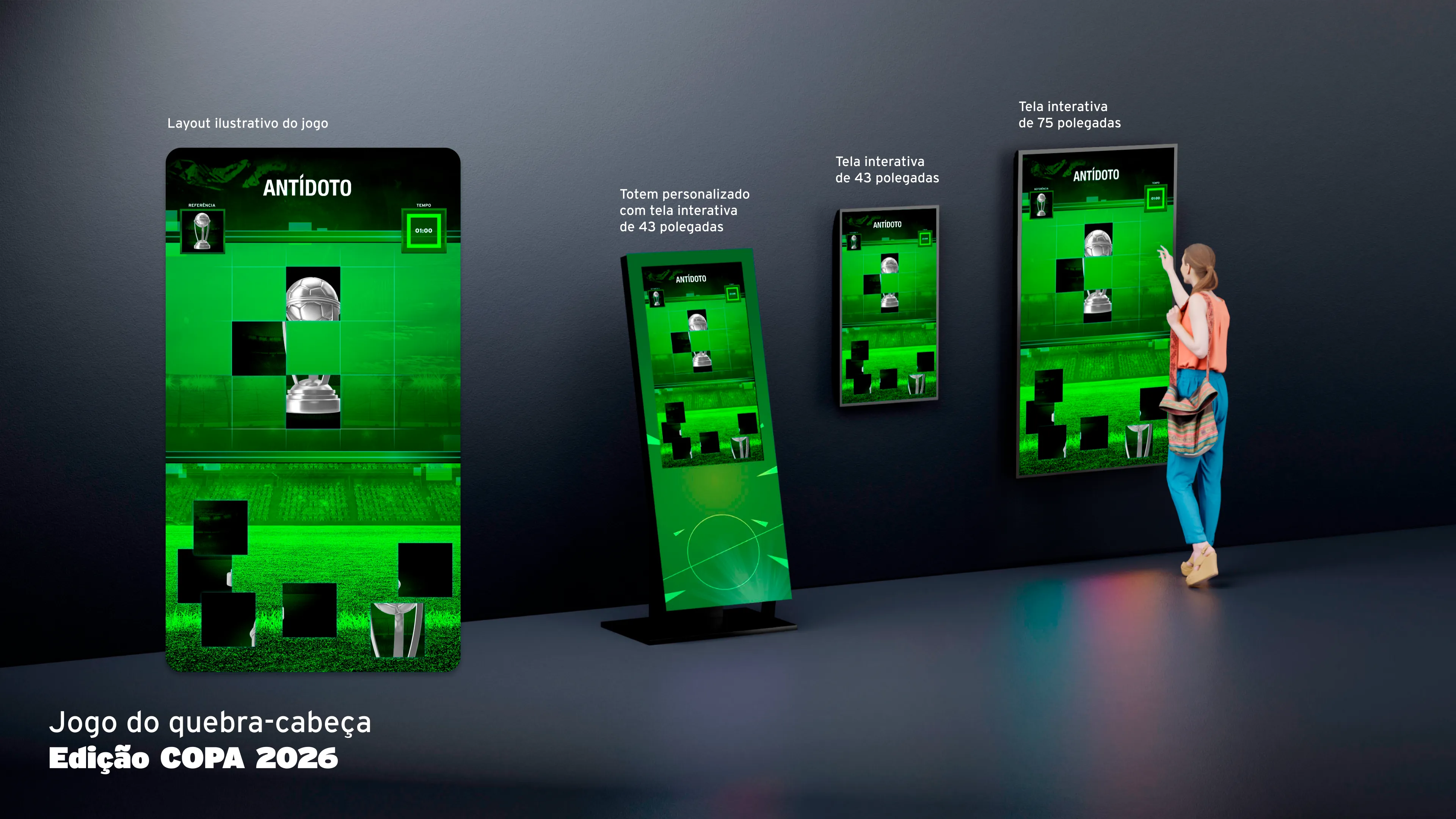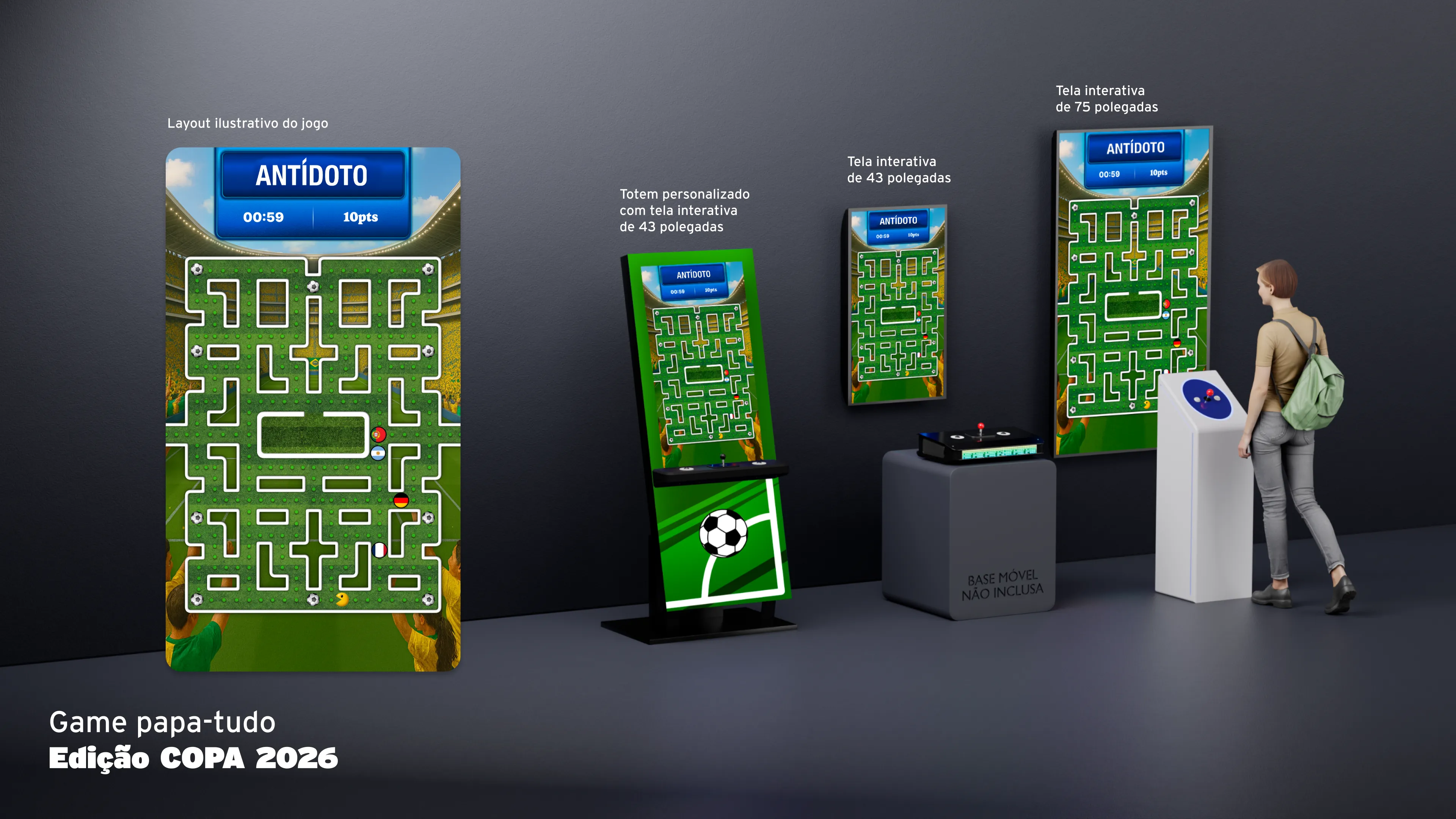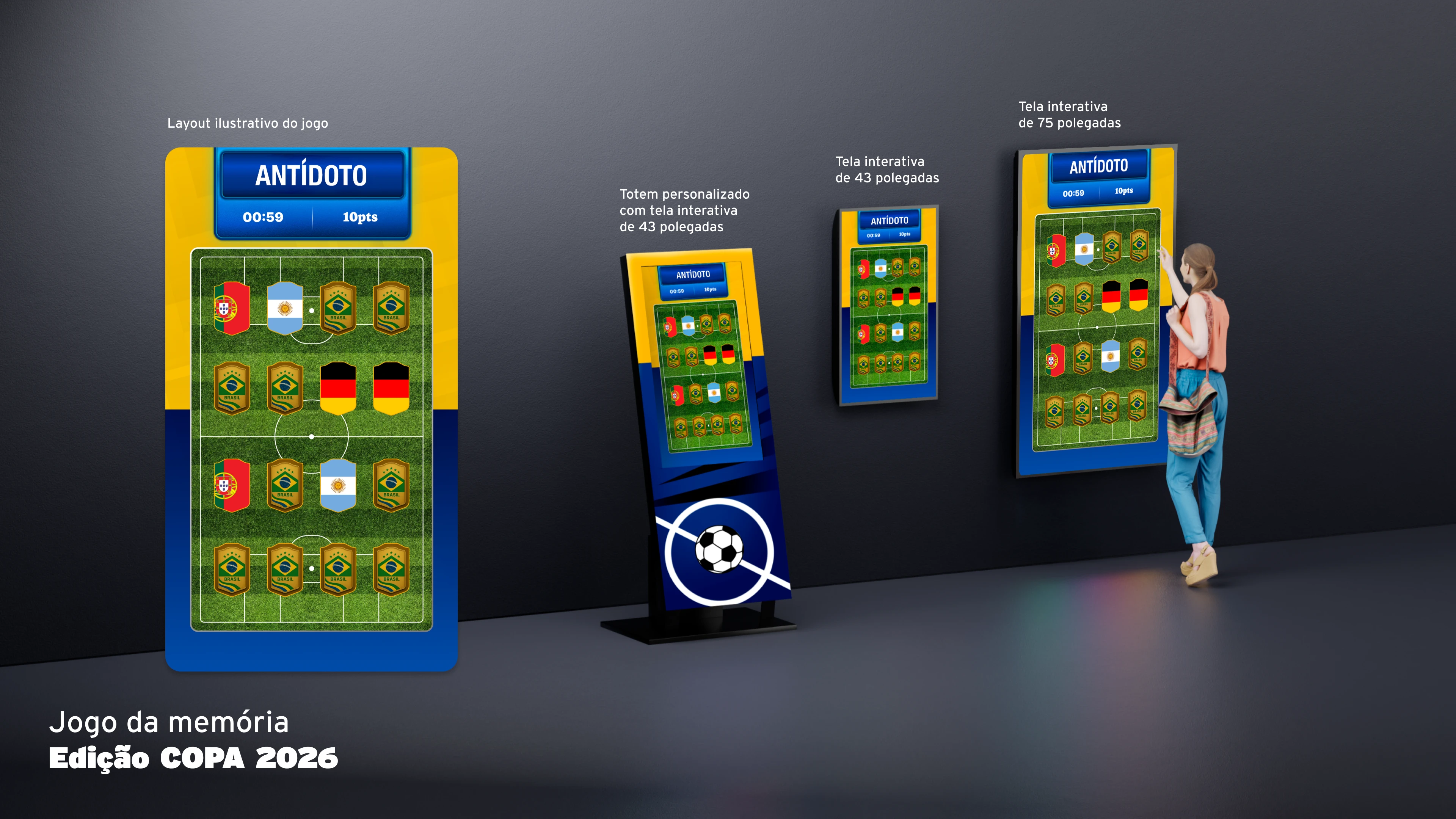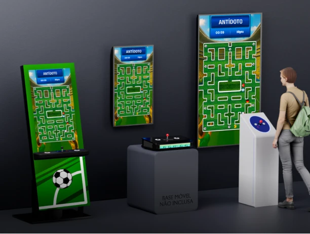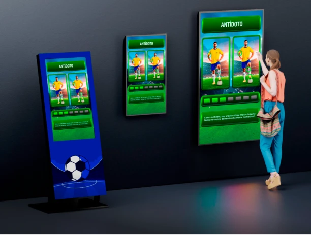 Estações interativas da Antídoto com tema Copa reúnem diversos games simultâneos, todos com temática de futebol.