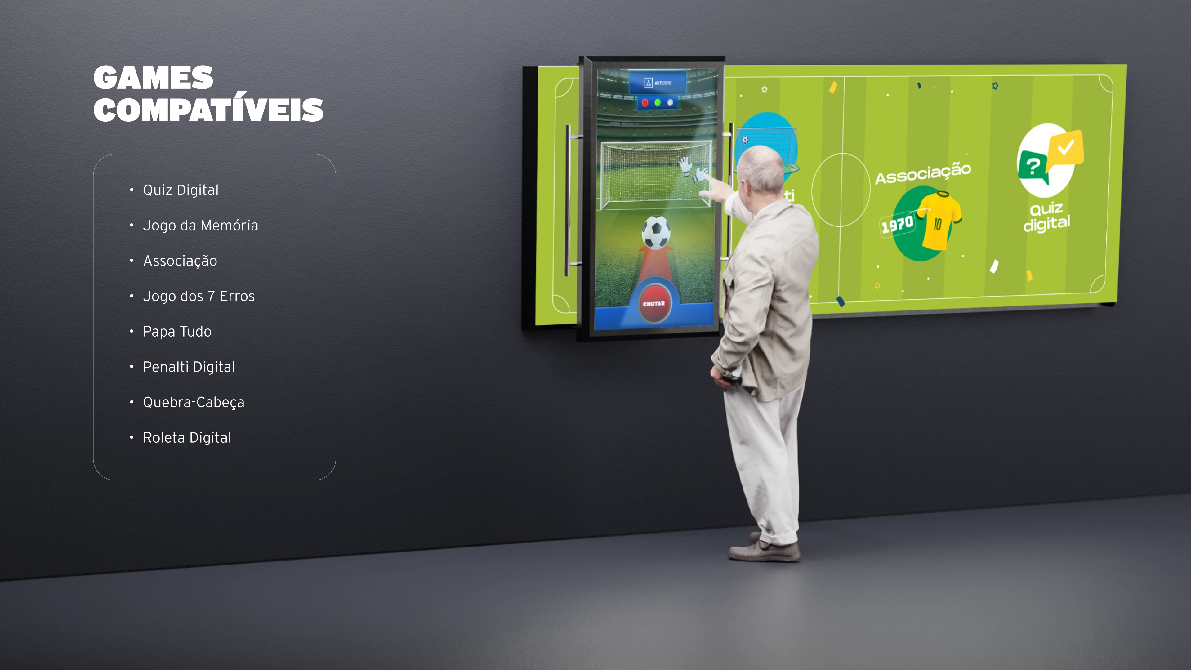 Clássicos como Tetris, Pacman, Pinball ganham versões com temática de futebol, combinando interatividade e personalização — diversão para todas as idades com atmosfera de Copa.