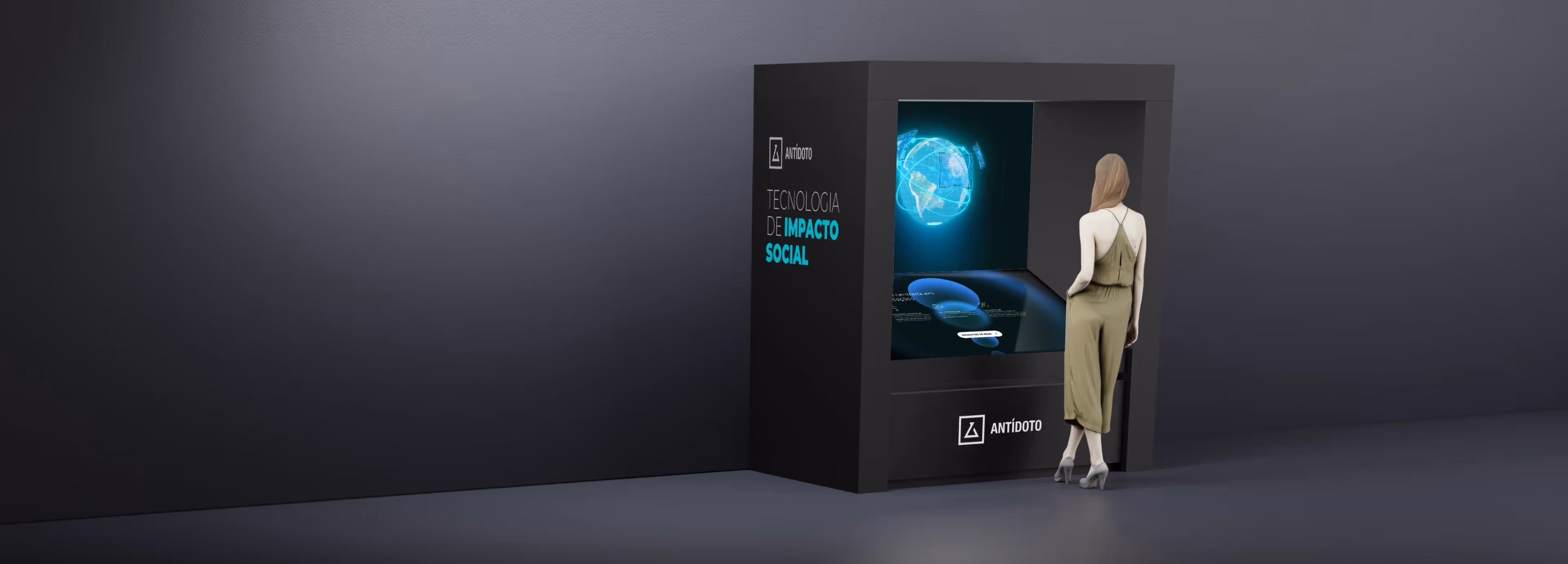 Sua estrutura em formato de cubo integra uma tela touch screen de 75 polegadas e um painel com efeito holográfico, visual, imersivo e cativante.