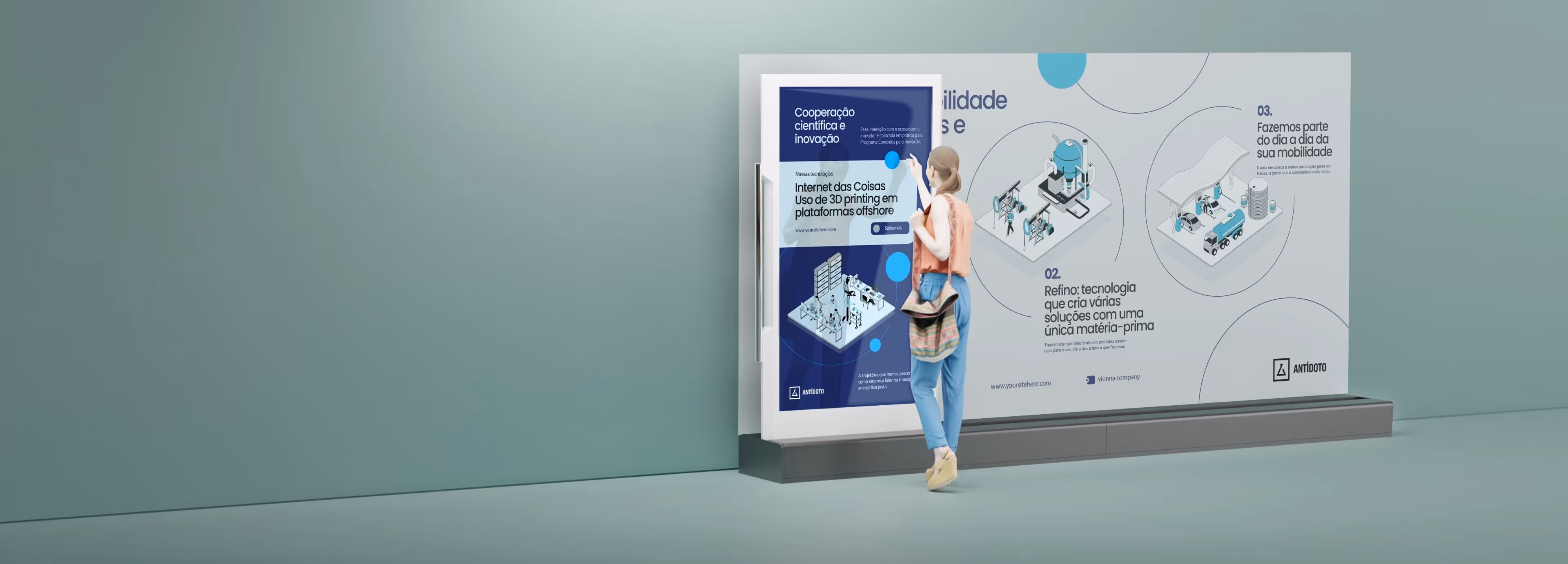 Com uma tela deslizante de 75 polegadas que percorre até 4 metros, essa solução permite explorar conteúdos em paredes personalizadas, lonas, maquetes, objetos físicos e muito mais. Enquanto a tela desliza, os hotspots interativos revelam vídeos, infográficos, jogos, quizzes e apresentações, criando um storytelling envolvente e imersivo.